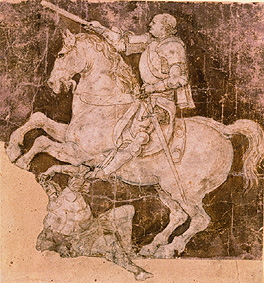 links: Jan van Eyck - Die Streiter Christi Das linke Bild des brühmten Genter Altars von 1432 zeigt ein gerittenes Pferd in schöner Aufrichtung, ein Beweis für das hohe Niveau der Reitkunst in der Renaissance. Es wird von seinem Reiter mit "falschen Zügeln" beidhändig geführt, wie es Guérinière für Pferde empfielt, die sich noch in der Ausbildung befinden. ![]() Das Fresco aus dem Palazzo Publico in Siena von 1328 stellt einen sienesischen Heerführer dar, der es offenbar eilig hat. Der Vergleich mit den beiden Nebenbildern zeigt, dass es in der Renaissance wie zu allen Zeiten auch schwache Reiter gegeben hat, die ihr Pferd bei weggedrücktem Rücken nicht beizäumen konnten. Die Zäumung ist für schlechte Reiter geeignet. Nur die leichte Zügelhand spricht zu Gunsten des vornehmen Herren. |