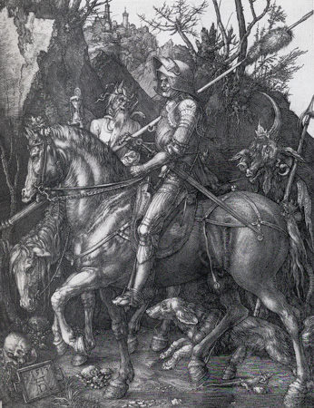 Albrecht Dürer - Ritter Tod und Teufel. Der Kupferstich wird in vielen Darstellungen der Geschichte der Reiterei als Beleg für für die Reittechnik der Renaissance gewertet. Das Bild ist meisterhaft komponiert, von großer Tiefe und Ausdruckskraft, die durch den Körper des Reiters gehende Linie dient aber der Gliederung der Bildfläche, die Reitweise dürfte Dürer kaum interessiert haben. Ebenso scheint er sich mit der Anatomie des Pferdes nicht sehr beschäftigt zu haben, wie die misslungene Darstellung der Vorhand und des zu langen Hinterbeins zeigt. Reiterbild des Antonio Pollaiolo - 1460 Ebenso Misslungen ist die Darstellung von Reiter und Pferd auf diesm Bild. Alle Details würden einen Kenner vom Kauf des Pferdes Abstand nehmen lassen, man fragt sich, wie man in diesen Sattel kommt und der Reiter scheint Probleme mit den Knien zu haben. |