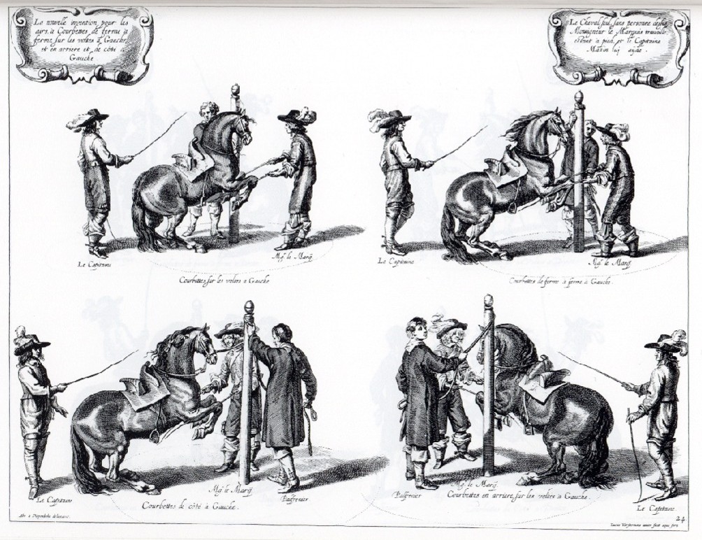 | Die Bilder von Abraham van Diepenbeek aus Newcastle's Buch "Horsmanship" sind zwar von unbestreitbarer künstlerischer Qualität aber für Rückschlüsse über die Reitweise kaum zu gebrauchen. Während die stehenden Menschen durchaus natürlich wirken erscheinen die Reiter steif und angespannt in einer Haltung, die ein Mitschwingen der Mittelpositur unmöglich macht. Der von Guérinère hoch geschätzte Newcastle wünscht sich den Sitz des Reiter dagegen zwanglos und natürlich. Das Pferd ist unproportioniert, der Kopf seltsam verrenkt. |