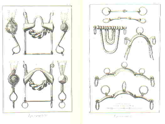 Auf dieser Bildtafel sind Einzelteile einer Kandarre zu erkennen. Hier und auf den weiteren Tafeln finden wir ein große Anzahl von verschiedensten Gebissen.