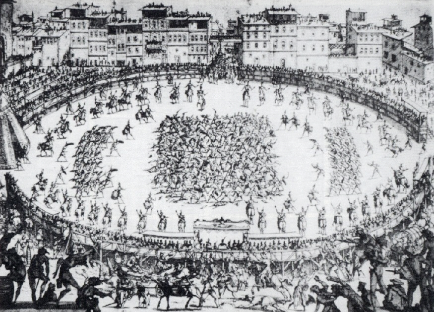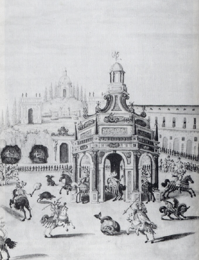 Bei festlichen Ereignissen aller Art spielten Pferde von der Antike bis ins 18. Jahrhundert eine weitaus größere Rolle als heute. Dazu stellt sich die Frage, welchen Pferdetyp man hierzu benötigte und welche Ausbildung diese haben mussten. Wer Erfahrung im Quadrillereiten hat weiß, wie schwierig schon eine Vorführung auf A-Niveau ist. Auf Gand-Prix-Niveau mit Schulen über der Erde benötigt man Pferde, die jahrelang sorgfältig und fachgerecht ausgebildet wurden. Wie hoch die Anforderungen waren, können wie ermessen, wenn wir die Beschreibung des Pferdeballetts betrachten, das anlässlich der Hochzeit von Leopold I mit der spanischen Prinzessin Margarita in Wien aufgeführt wurde. Solche Veranstaltungen waren seit dem Mittelalter häufig und verbreitet. Man benötigt dafür auf höchstem Niveau ausgebildete Schulpferde, wie sie nur in Reitställen der Wohlhabenden vorhanden waren. Zahlreiche Quellen berichten davon. Über den Reitbetrieb und die Ausbildung der Pferde erfahren wir aber bis 1550 Grisones Buch erscheint nichts. Die Mitwirkenden wurden dabei überigens gut bezahlt. Die Motivation für die tägliche, jahrelange Arbeit wird aber nicht die mögliche Teilnahme an einem Pferdeballett gewesen sein. Nur die Freude und Begeisterung an der Reitkunst kann einen begabten Reiter anhalten, soviel Mühe in die Ausbildung eines Pferdes zu investieren. Turnier am Hofe von Savoyen, 1650 - Gli Hercoli Domatori de Mostri et Amore Domatore de gli Hercoli