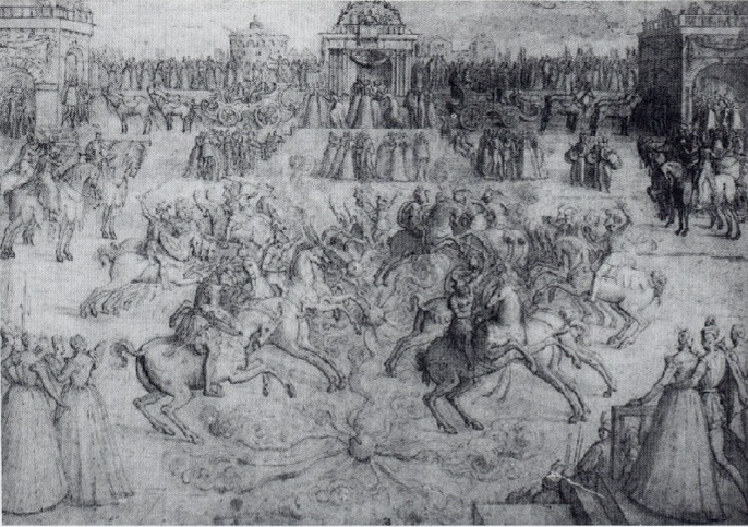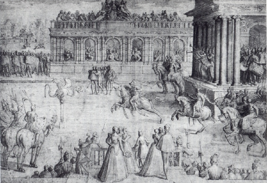Die magnificences>/i> von Bayonne, 1565. Das Eröffnungsturnier der Nationen. Karl IX, als Trojaner verkleidet, reitet auf die Holzfigur eines Drachen los, hinter ihm sein Bruder im Kostüm einer Amazone. Die magnificences>/i> von Bayonne, 1565 Das Turnier der Ritter Gr0ßbritanniens und Irlands. Dabei wurden zwischen die Kämpfenden Feurkugeln geworfen.